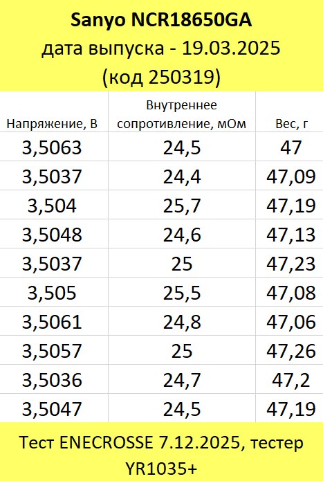 Мы не гарантируем, что вы получите аккумуляторы именно с такими значениями напряжения и внутреннего сопротивления, как указано выше и на фото в галерее. Эта информация приводится нами лишь для того, чтобы вы могли оценить качество аккумуляторов данной серии, оценив разбег напряжения и внутреннего сопротивления в ВЫБОРКЕ из 10 шт. Мы стараемся поддерживать эту информацию по выборке максимально актуальной (так как в разных партиях параметры могут различаться).*При полном заряде (максимальном напряжении) внутреннее сопротивление может быть ниже значения, полученного при измерении на «напряжении хранения».