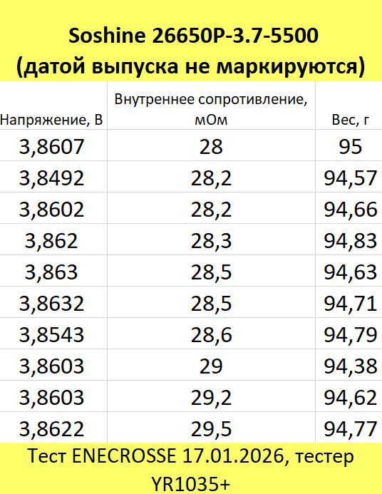 Мы не гарантируем, что вы получите аккумуляторы именно с такими значениями напряжения и внутреннего сопротивления, как указано выше и на фото в галерее. Эта информация приводится нами лишь для того, чтобы вы могли оценить качество аккумуляторов данной серии, оценив разбег напряжения и внутреннего сопротивления в ВЫБОРКЕ из 10 шт. Мы стараемся поддерживать эту информацию по выборке максимально актуальной (так как в разных партиях параметры могут различаться).