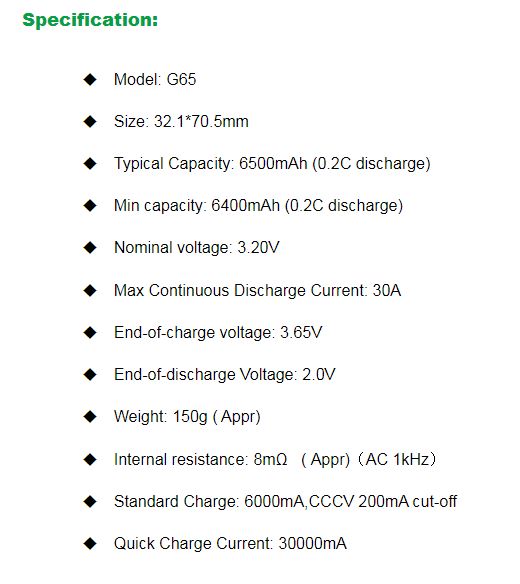 Отзывы про Аккумулятор Li-Ion Vapcell INR32700 G65 (3,2 В, 30 A, 6500 мАч, 32,1x70,9 мм)