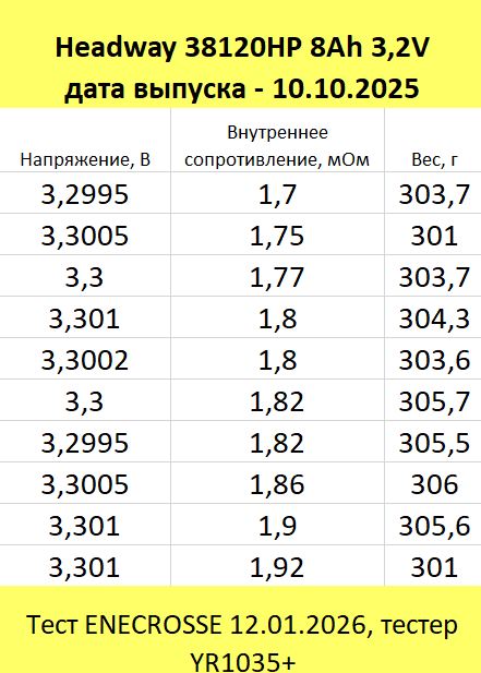 Мы не гарантируем, что вы получите аккумуляторы именно с такими значениями напряжения и внутреннего сопротивления, как указано выше и на фото в галерее. Эта информация приводится нами лишь для того, чтобы вы могли оценить качество аккумуляторов данной серии, оценив разбег напряжения и внутреннего сопротивления в ВЫБОРКЕ из 10 шт. Мы стараемся поддерживать эту информацию по выборке максимально актуальной (так как в разных партиях параметры могут различаться).