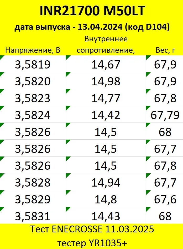 Мы не гарантируем, что вы получите аккумуляторы именно с такими значениями напряжения и внутреннего сопротивления, как указано выше и на фото в галерее. Эта информация приводится нами лишь для того, чтобы вы могли оценить качество аккумуляторов данной серии, оценив разбег напряжения и внутреннего сопротивления в ВЫБОРКЕ из 10 шт. Мы стараемся поддерживать эту информацию по выборке максимально актуальной (так как в разных партиях параметры могут различаться).