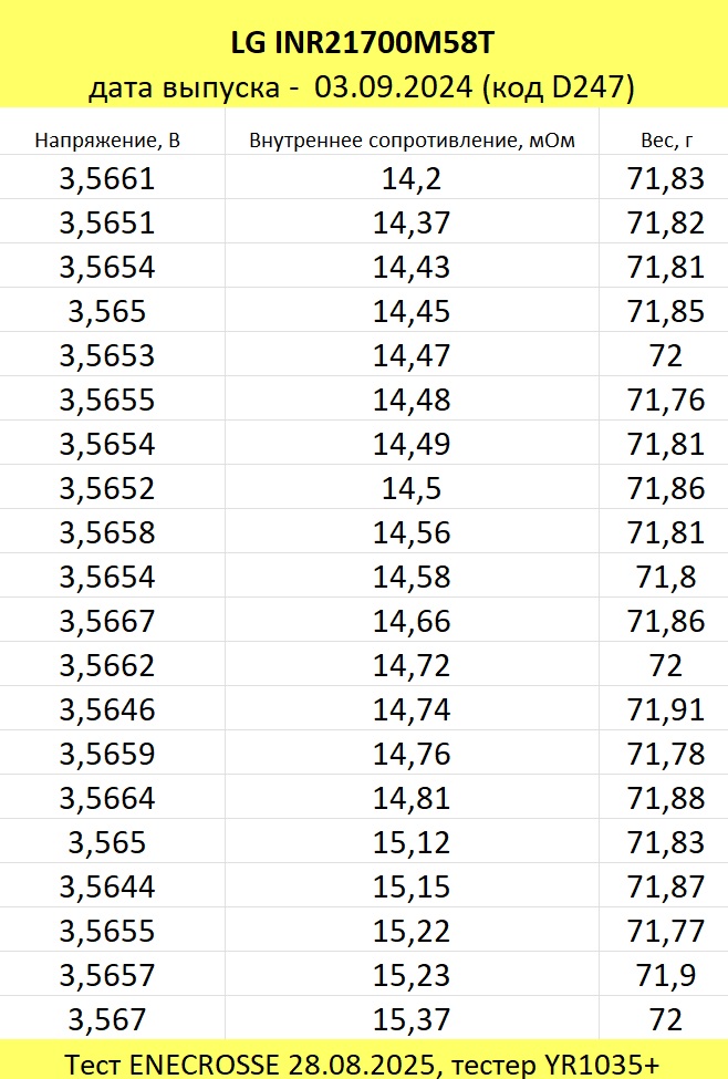 Арт. 006740Дата выпуска - 03.09.2024 (код D247)Модель: INR21700M58T Типоразмер: 21700 Плата защиты НЕТ Емкость, НАШ ТЕСТ на ZKETECH EBC-A40L: - разряд до 2,5 В током 0,2C – 1,16 А: 5600 мАч (19,89 Вт·ч) (среднее напряжение – 3,55 В) Ресурс: 500 циклов (емкость ≥ 80%C, при следующих условиях: заряд 2,7 А (4,2 В, CC/CV, отсечка на 0,1 A), разряд 7,5 А (2,5 В, CC/CV, отсечка на 0,1 A) Минимальная емкость, данные производителя: 5570 мАч Ток разряда максимальный (постоянный): 12,5 А (с контролем температуры аккумулятора - не выше 70°C) Ток разряда максимальный (импульсный): В зависимости от рабочей температуры -20 ~ 0℃ - 9 А, 15 с 0 ~ 60℃ - 15 А, 15 с Ток разряда номинальный: 1,12 А Внутреннее сопротивление: 15,37 мОм Напряжение номинальное: 3,59 В Напряжение максимальное: 4,2 В Напряжение минимальное: 2,5 В Ток заряда номинальный: 1,12 A (4,20 В, CC/CV, отсечка на 0,112 A) Ток заряда максимальный: В зависимости от рабочей температуры 0 ~ 10 ℃ - 1120 мА 10 ~ 50 ℃ - 2700 мА Температура окружающей среды: Заряд: от 0 до 50 °C Разряд: от -20 до 60 °C Температура аккумулятора: Заряд: от 0 до 55 °C Разряд: от -20 до 70 °C Размеры по спецификации: высота 70,60 ~ 71,00мм, диаметр 21,30 ~ 21, 80 мм Размеры (наш замер): высота 70,65 мм, диаметр 21,50 мм Вес: 71,76…72 г Внутреннее сопротивление при напряжении: 3,565…3,567 В: 14,2...15,37 мОм (наш замер профессиональным тестером* YR1035+ на частоте 1 кГц) ОБРАТИТЕ ВНИМАНИЕ: Мы не гарантируем, что вы получите аккумуляторы именно с такими значениями напряжения и внутреннего сопротивления, как указано выше и на фото в галерее. Эта информация приводится нами лишь для того, чтобы вы могли оценить качество аккумуляторов данной серии, оценив разбег напряжения и внутреннего сопротивления в ВЫБОРКЕ из 20 шт. Мы стараемся поддерживать эту информацию по выборке максимально актуальной (так как в разных партиях параметры могут различаться). *Почему все ЗУ с функцией измерения внутреннего сопротивления делают это крайне неточно? (убедиться в неточности очень легко: вставьте один и тот же аккумулятор в разные слоты ЗУ/делайте повторные измерения/нажимайте сильнее на подвижную "салазку" слота при измерении - каждый раз результат будет разным!) Ответ: Все зарядные устройства с функцией измерения импеданса измеряют внутреннее сопротивление (IR) аккумуляторов методом постоянного тока при разряде. При таком методе ЗУ измеряет две составляющие IR - омическое и поляризационное сопротивление. Профессиональный тестер YR1035+, который мы используем (есть в продаже в нашем магазине), проводит тест на переменном токе: он измеряет проводимость аккумулятора (единица измерения - сименс) на частоте 1 кГц, затем проводит обратный расчет (при этом прибор анализирует только омическую составляющую, поляризационная нивелируется). Именно поэтому прибор, вычисляющий IR методом переменного тока, будет всегда гораздо точнее обычных ЗУ-анализаторов – у новых качественных аккумуляторов значение IR на YR1035+ будет всегда соответствовать показателю, указанному в спецификации производителя. Дополнительную точность YR1035+ обеспечивает использование 4-х контактного метода измерения (при этом нивелируется простеночное сопротивление контактов). Предупреждение Вы должны иметь соответствующее представление о потенциальных опасностях литий-ионных аккумуляторов, прежде чем оформлять заказ и использовать их. Неправильное использование технологического (незащищенного) Li-Ion аккумулятора может привести к пожару или взрыву, к