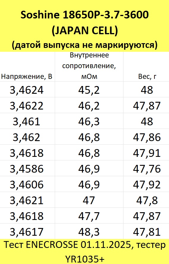 Мы не гарантируем, что вы получите аккумуляторы именно с такими значениями напряжения и внутреннего сопротивления, как указано выше и на фото в галерее. Эта информация приводится нами лишь для того, чтобы вы могли оценить качество аккумуляторов данной серии, оценив разбег напряжения и внутреннего сопротивления в ВЫБОРКЕ из 10 шт. Мы стараемся поддерживать эту информацию по выборке максимально актуальной (так как в разных партиях параметры могут различаться).