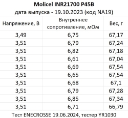 Внутреннее сопротивление (импеданс) при напряжении: 3,49…3,51 В*: 6,65...6,85 мОм (наш замер у 10 аккумуляторов профессиональным тестером** YR1035+ на частоте 1 кГц)