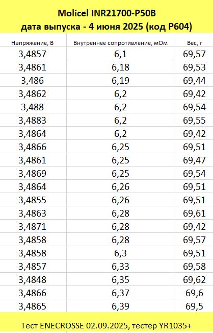Мы не гарантируем, что вы получите аккумуляторы именно с такими значениями напряжения и внутреннего сопротивления, как указано выше и на фото в галерее. Эта информация приводится нами лишь для того, чтобы вы могли оценить качество аккумуляторов данной серии, оценив разбег напряжения и внутреннего сопротивления в ВЫБОРКЕ из 10 шт. Мы стараемся поддерживать эту информацию по выборке максимально актуальной (так как в разных партиях параметры могут различаться).