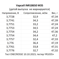 Внутреннее сопротивление при напряжении 3,77V*: 32,4-36,4 mOm (наш замер профессиональным тестером** YR1035+ на частоте 1 кГц (10 аккумуляторов).